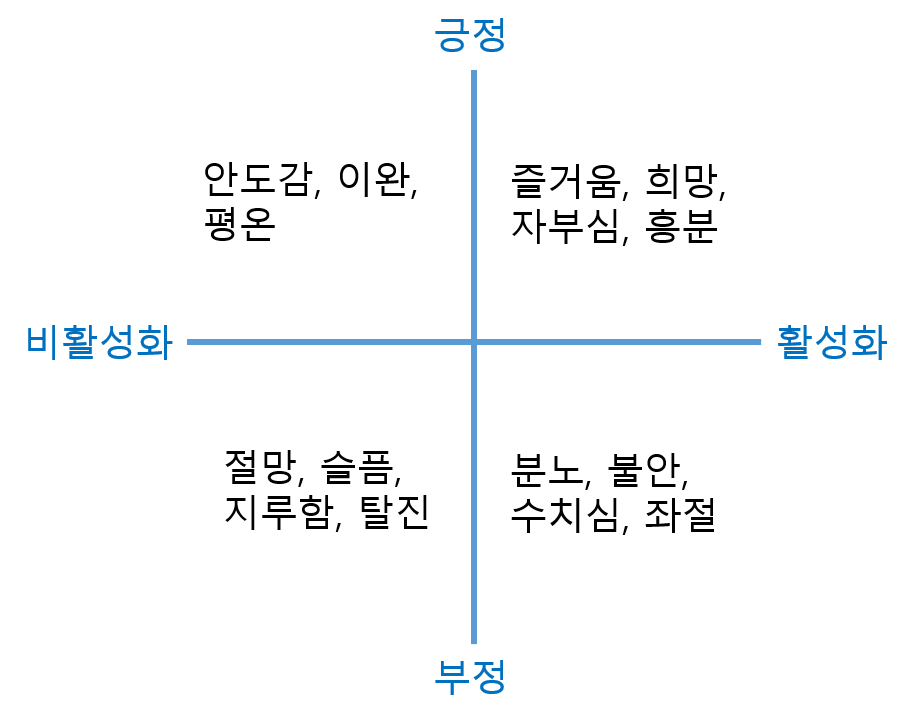 - 정서 상태를 긍정적/부정적으로 분류하고 활성화/비활성화로 분류함으로써 감정 및 기분을 4가지 범주로 분류할 수 있다.